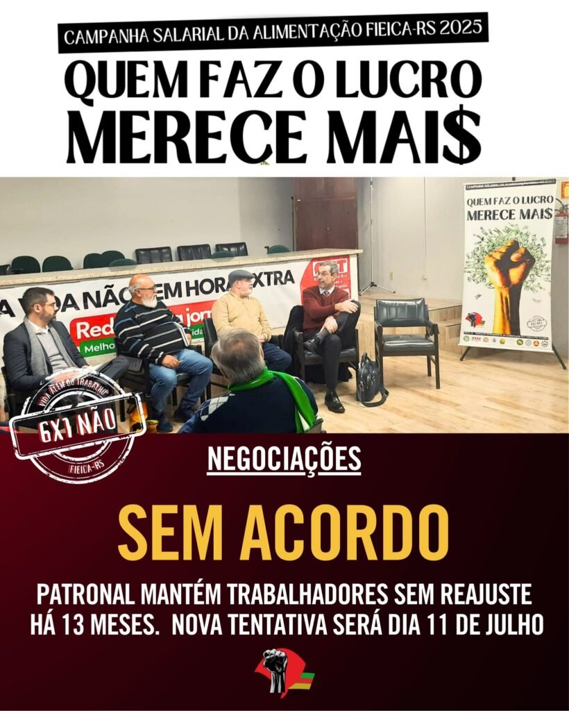 As reuniões realizadas nesta terça-feira (24) entre as federações dos trabalhadores da alimentação e os representantes patronais terminaram sem avanços concretos. A FIEICA-RS (Federação Intermunicipal dos Empregados nas Indústrias da Alimentação do RS) e a FTIA-RS (Federação dos Trabalhadores nas Indústrias da Alimentação do RS), junto com os sindicatos da base, participaram de duas rodadas […]